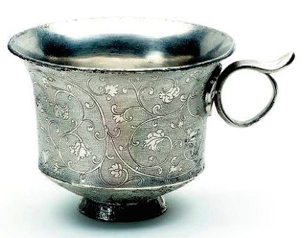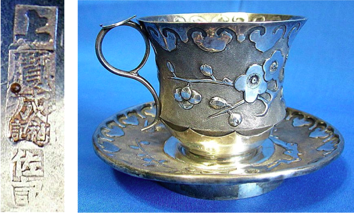 This superb and rare cup and saucer [above] is particularly interesting since it is clearly inspired by Tang silver from almost 1200 years previous, as the illustration of a tang silver gilt cup, circa 700CE] [below] shows. It is difficult to accurately date this piece, but circa 1870-80 is probably right and it was made for the Shanghai retail silversmith Bao Cheng, one of a core group of silversmiths operating there known as “the nine factories”, but what makes it even more interesting is shown in the silver mark which tells us this is Bao Cheng Yue Ji, a branch of the established Bao Cheng dynasty. An expansion of a retail silversmith demonstrates that Shanghai was sufficiently booming to warrant it.