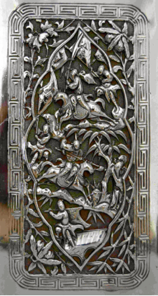 Returning to the battlefields of the featured tea set – it transpires that the battles were not just confined to the silver panels in this instance. Having stunned me by its exuberance and workmanship, it was this tea set that led to the ultimate discovery that a long-running misconception had existed in the Chinese Export Silver world since the mid 1960’s. It was then that Crosby Forbes created his treatise which has been acknowledged as the unofficial “bible” for collectors ever since – and rightly so, because at the time it was a major breakthrough. But it was compiled on the information at hand at the time and it should be remembered that fewer than 200 pieces of Chinese Export Silver had been identified when the first exhibition at the China Trade Museum in Salem Massachusetts was staged. In 1984, when the second major exhibition was staged that figure had risen to 2000 pieces. His work was also confined to Canton and Massachusetts. Anyone who has any connection with this silver category will know there are tens of thousands of pieces out there; we shall probably never know how many.