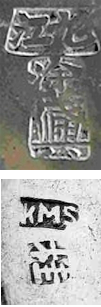 But the confusion doesn’t really end there and this is actually of slight concern because there are dealers out there who consistently catalogue what would have been Kan Mao Hsing pieces as Kwong Man Shing. The latter is a totally other maker working in Hong Kong and Canton, albeit in the same period, but his work is very different – as are his maker’s marks. An example of Tu Mao Xing’s mark can be seen above left; Kwong Man Shing’s mark is below left and, as you see, always features the KMS initials and a Chinese chopmark. Tu Mao Xing’s mark is always only in Chinese characters. In my own personal view, there’s a quality difference too; Tu Mao Xing is superior and, in being so, should command higher values.