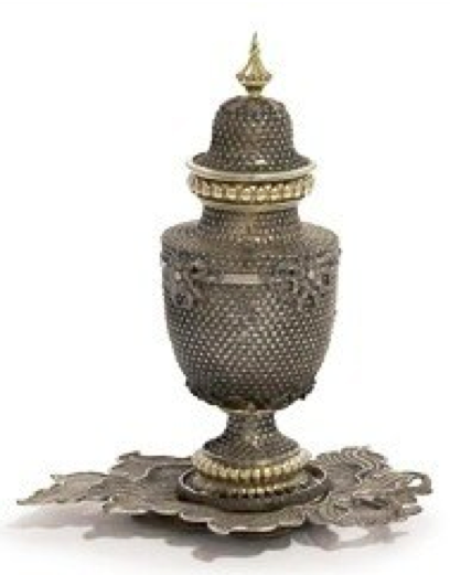 Here we have a Chinese Export Silver lidded urn and stand of intricately woven filigree silver and silver gilt, decorated with applied garlands, flowers and foliage. It is attributed to Pao Ying of Canton; almost identical urns have been identified as such. Such decorative pieces were obviously made for a very specific market. We know they existed among Catherine the Great’s collection of Chinese silver just as we know that few Chinese silversmiths were actually capable of creating them due to the highly skilled techniques they required. There is beginning to be a school of thought that the Canton retail silversmith Cutshing may have actually existed prior to the first known recorded date of 1825, however, since 18th century Chinese silver rarely carried a mark, it will be quite difficult to verify. The tea pot below, created at the cusp of the 17th and 18th centuries demonstrates yet again the high level of craftsmanship.