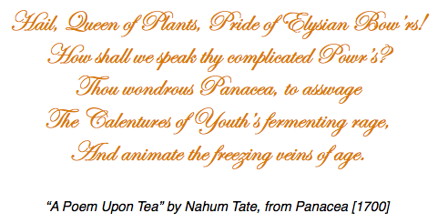Perversely, it was the London coffee houses that were responsible for introducing tea to England. One of the first coffee house merchants to offer tea was Thomas Garway, who owned an establishment in Exchange Alley in the City of London, at the side of the Stock Exchange. He sold both liquid and dry tea to the public as early as 1657. Three years later he issued a broadsheet advertising tea, touting its virtues as “it maketh the body active and lusty” and “preserving perfect health until extreme old age” as well as “It vanquisheth heavy Dreams, easeth the Brain, and strengtheneth the memory”.