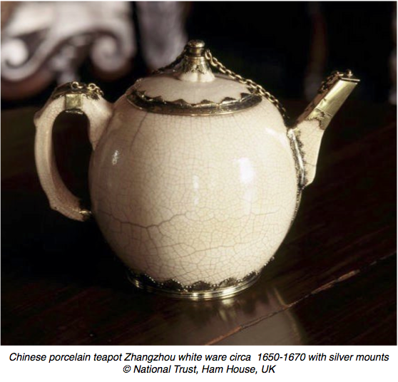 From the identical period, we have this Chinese Zhangzhou white ware porcelain tea pot that has had silver mounts added to it which appear to be Chinese also rather than applied by an English silversmith. Zhangzhou ware is also known as Swatow ware; Swatow being the port where porcelain from several counties in Guangdong province was shipped from. This is considered a rather iconic tea pot. It was owned by Elizabeth, Countess of Dysart to become, through marriage, Duchess of Lauderdale and was a huge political supporter of Charles II – highly unusual for a woman at that time. As with Catharine of Braganza, this