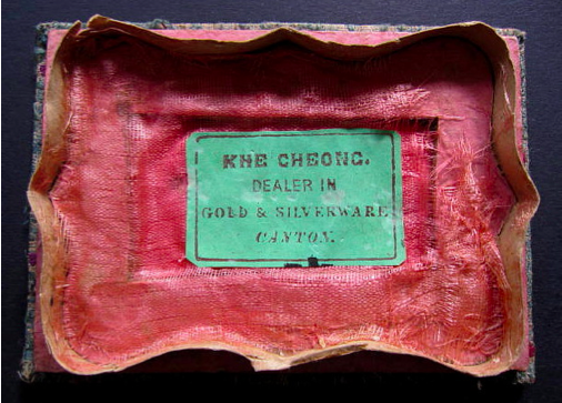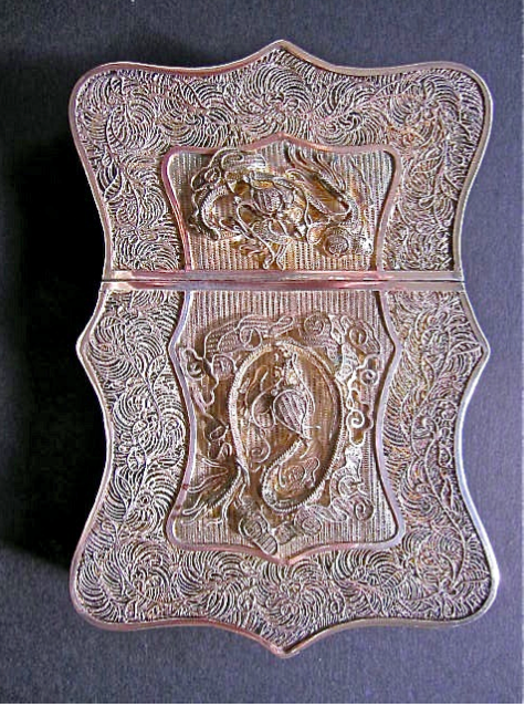 Above we have the original box packaging to a Chinese Export Silver filigree card case made, obviously, by Khe Cheong of Canton. The case, which we see pictured right, is quite obviously from this box that was tailor-made specifically for it. The box also confirms, that Khe Cheong should be two words instead of one, which has been the adopted format in most listings for this maker. It indicates that Khe Cheong was also a retailer/dealer as well as a maker; albeit it was known that Khe Cheong operated from 2 premises in Canton. The card case in question is filigree silver and although Khe Cheong had several versions of his KHC mark, the card case appears not to carry a mark. This is not particularly unusual with Chinese Export Silver filigree card cases, but since silver filigree work is a very specific skill, it could indicate that Khe Cheong commissioned it from one of the few silver filigree master silversmiths working in China. All in all this adds to a more complete picture we normally have for what is essentially a fine piece of Chinese export Silver. The date for the card case is circa 1860.