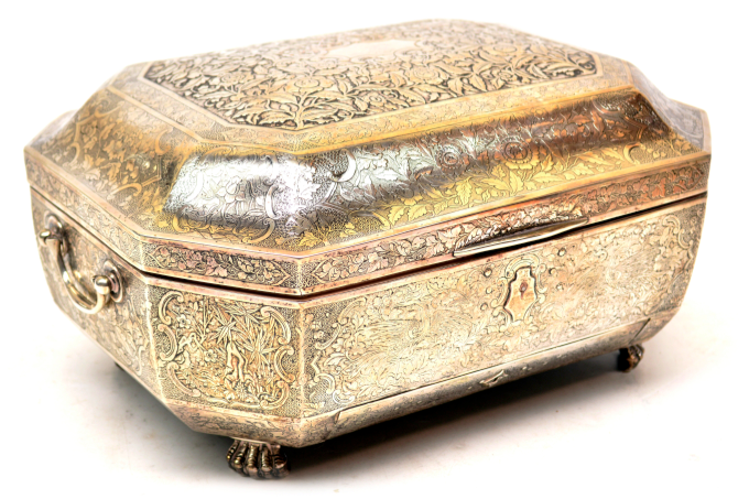 But researching almost always leads to tangential discoveries and purely by chance when I was presented with the image of this Khe Cheong packaging, I stumbled upon a Khe Cheong casket box [below] that was sold at auction on 31st May 2013 at Adam Partridge Auctioneers in the UK for a staggering £29,000 [$44,400]. The box, weighing a hefty 8490gm is quite unique and is fitted out as a sewing box. It is lavishly decorated with embossed peonies around a central cartouche on the lid and around the sides. The interior is fitted out with compartments and a drawer. The whole sits upon claw feet. This piece is so exceptional it almost has to have been specially commissioned. Had the card case not appeared in my life, the casket probably would have crept under my radar.