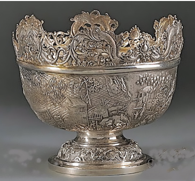 Once again, a Monteith is such a specific object that this, too, is almost certainly a commissioned piece, although it is not unusual to find Wang Hing and Luen Wo pieces that carry additional Scottish silver hallmarks such as Hamilton & Inches in Edinburgh and Edwards and Sorleys in Glasgow; this piece simply carries the Chinese marks. Historically, as a form, Monteith-style bowls date back to the 17th century. Their scalloped rims are so designed as to allow stemmed wine cups to be suspended by the foot and chilled in iced water contained in the bowl. The name “Monteith” is believed to have come from the eccentric and rather bankrupt Scottish 7th Earl of Menteith [Monteith] who wore a cloak with a scalloped hem. This particular piece, though, is a fine example of how Chinese Export Silver makers were able to adapt an essentially European form and object and decorate it in the high Chinese style.
