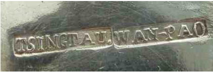 We see the maker’s mark above; there are no accompanying marks with Chinese characters. In my research it transpired that Tsingtau was the German Romanisation of the city name Qīngdǎo. Not only was the maker a new discovery for me, but what makes Qīngdǎo interesting is that it was a German concession renamed Tsingtau from 1898-1914. Wan-Pao is equally unusual in as much as it was making silver in the high Chinese style specifically for the German market.