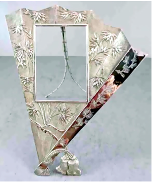 On the left we have a rather delicious Chinese Export Silver picture frame in the form of a pleated fan decorated with a high relief bamboo motif against a finely planished background made by the Shanghai maker Tuck Chang & Company. Although this seems to me to be so redolent of a very stylish a somewhat decadent Shanghai at the very beginning of the 20th century, I have to say that I’ve never seen anything similar even though the Chinese silversmiths were quite inventive when it came to photograph frames. The tripod faux bamboo stand at the back, though, is typical and seems to be a uniquely Chinese solution to a picture frame easel prop.