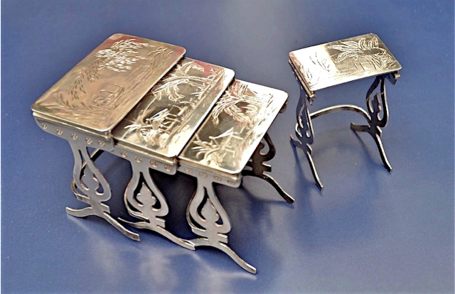 Pictured above, we have a circa 1895 Chinese Export Silver nest of 4 tables by Wang Hing. While European silver miniature furniture is not unheard of, I have never seen miniature silver furniture before by a Chinese silversmith [by miniature, I am talking doll’s house size]. This example displays particularly fine workmanship since each table slots perfectly into to the next making it high-precision silversmithing and the decorative detailing is superbly executed.