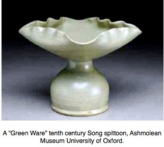 Song era spittoons are to be found in stoneware, porcelain, lacquer and silver; which material was first is nigh impossible to determine. However, in the 10th century Song spittoon [pictured left] we can begin to see the evolution of the wide fluted inclined rim is not dissimilar from the 19th century Luen Wo spittoon, but it’s that very rim that attests to the vessel’s usage.