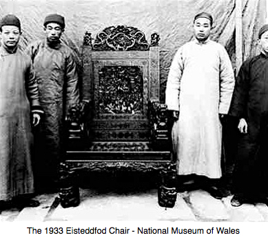 Here we see the 1933 Eisteddfod Chair that took students at T’ou Se We over a year to carve. It was given to the National Eisteddfod in Wales by a successful Welshman living in Shanghai – Dr John Robert Jones, a barrister and an avid Eisteddfod-goer who also showed great interest in Chinese art and culture. He went to Shanghai in 1924, became General Secretary of International Council in 1928, and was a leading figure in the Shanghai Society and Cymdeithas Dewi Sant. It was his idea to commission the craftsmen of T’ou-se-we to make the chair. An almost identical chair, also made at T’ou-se-we in the 1926 Swansea Eisteddfod.
