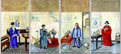 The paintings are done in traditional Chinese watercolors on paper. Each subject is depicted in his familiar attire, surrounded by the religious, scientific, and musical objects through which they achieved renown and are believed to be inspired by the 18th century  book “Description géographique,historique,chronologique,politique, et physique de l’empire de la Chine et de la Tartarie chinoise” that feature famous Jesuit missionaries in China. At the head of each painting is a biography written by Xia Dingyi, with one dated Minguo 3 [1914]. At the foot of each painting after the signature are the letters T.S.W. for T’ou-sé-wéi [Tushanwan].