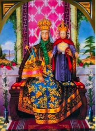 The method employed much of the time at T’ou Se We to inculcate students with mastering technique was simply to copy. The painting above is known as the “Dong Lu Our Lady of China” and is said to have been used as one of the most used paintings for students to copy. The painting is particularly special since the setting and the robes are based on an official painting of Empress Dowager Cixi herself. The concept of an “Our Lady of China” is an incongruous one. When the Boxer Rebellion finally came to an end, the pastor of Dong Lu, an impoverished missionary settlement near Beijing, managed to “secure” a portrait of the Empress Dowager. He then commissioned an artist to use the actual painting, retaining the background and the Imperial robes. The resulting picture was hung above the altar at Dong Lu. The painting was then adopted as the official image by the Shanghai Synod of Bishops and the church, altar and painting became a shrine. Pope Pius XI approved the shrine as an official Marian shrine. The painting became known as “Our Lady Queen of China”.