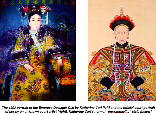It is also well-documented that the American painter Katherine Carl had a considerable influence at the T’ou Se We painting school. In 1903 Katherine spent nine months at the Forbidden City in Beijing where she had initially gone for a single sitting that Empress Dowager Cixi had granted her for the portrait of herself she had commissioned; Cixi felt immediately at ease with Katherine. The portrait was eventually finished on a date that had been declared optimally auspicious. The finished picture was a compromise of the traditional official portrait style of the Imperial court and Katherine’s own style that was loosely bordering on impressionism