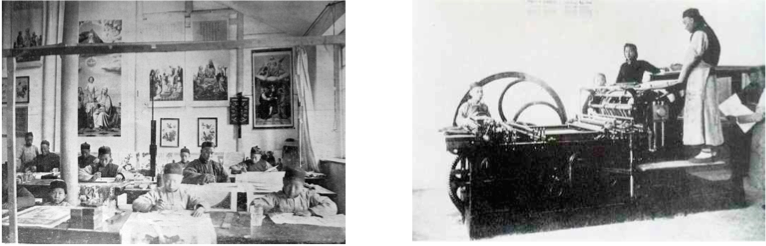 Other professors and artists at the orphanage included Brother Nicolas Massa [1815-1870] who taught oil painting, Brother Lu Baidu [1836-1880], Brother Adolphe Vasseur [1828-1899], and, most notably, Brother Liu Bizhen [1845-1912], all of whom were highly skilled woodcut engravers who produced work for evangelical publications – T’ou Se We students would often colour the prints, many of them woodcuts of the Evangelicae Historiae Imagines. T’ou Se We expanded its printing into photo-engravure and in the early 1900’s, Wenming, the largest Chinese publishing house began using T’ou Se We prints in its textbooks.