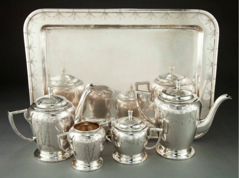 In December 2012, a rare example of T’ou Se We silver work appeared in auction in America. The 4-piece tea and coffee set and matching tray weighing some 4200gm is thought to be dated circa 1915 around the time of the exposition. It is known that silver was displayed at the Chinese pavilion at the expo.