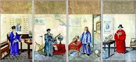 These paintings [below] were completed by T’ou Se We students in 1914 for a collection of arts and crafts items representing the newly formed Republic of China at the 1915 Panama-Pacific International Exposition held the following year in San Francisco. The paintings created in traditional Chinese watercolours on paper. Each subject is depicted in his usual attire surrounded by the religious, scientific, and musical objects through which they achieved their fame and are inspired by the 18th century book “Description géographique,historique,chronologique,politique, et physique de l’empire de la Chine et de la Tartarie chinoise” that feature famous Jesuit missionaries in China. At the head of each painting is a biography written by Xia Dingyi, with one dated Minguo 3 [1914]. At the foot of each painting after the signature are the letters T.S.W. for T’ou-sé-wéi [Tushanwan].