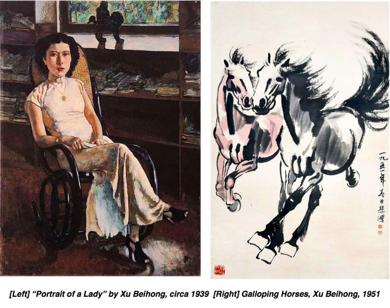 A split personality of styles was not unusual for acknowledged artists who had gone through the T’ou SeWe art school. The well-known and highly prolific artist Xu Beihong had two definitive style that stood poles apart. He was best known for his semi-traditional horse paintings, but his portraits were wonderfully atmospheric, used a very particular palette and almost always redolent of the age they were painted in.