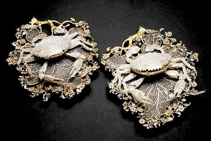 These stunningly exquisite pair of boxes form part of the same extraordinary set and were used for storing lipsticks and rouges; created as crabs, they sit upon trays that are probably the finest example of Chinese silver filigree. Why crabs? There is a subtle allegorical meaning to these boxes that only someone such as Catherine could fully appreciate. Each crab is holding a sprig of a rice plant; in Chinese culture this combination forms a rebus that symbolises peace and harmony. But a crab is also symbolic of an “iron clad general”.