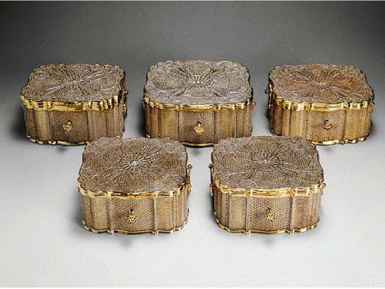 Here [above] we have a pair of almost identical urns that have been attributed to Pao Ying and dated circa 1800. It is identical work to much of the Chinese Export Silver filigree items that formerly belonged to Catherine the Great and now form part of the largest single collection of Chinese silver filigree in the world to be found at the State Hermitage Museum in St Petersburg. This set of five silver gilt caskets [below] formed part of the Empress’s 32 piece toilet set at the Winter Palace.