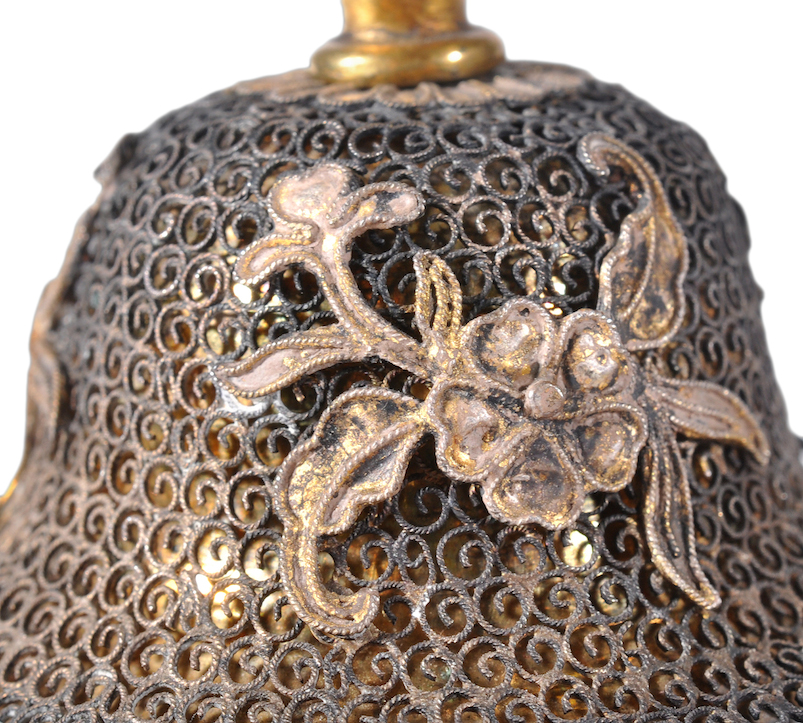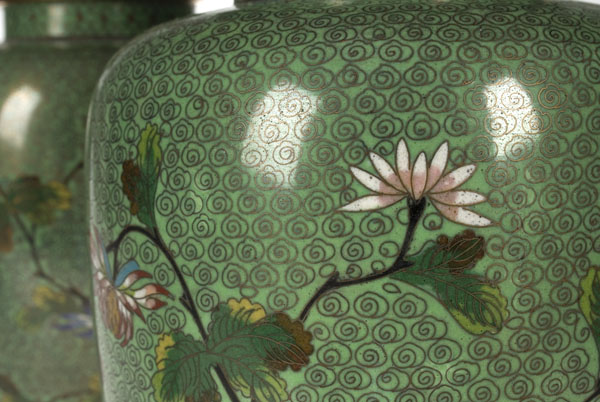 The background silver wire work is an interesting fusion of what is considered traditional silver filigree work of Jewish silversmiths and the equally traditional Chinese swirling cloud motif yún – an auspicious decorative motif that dates from the Han Dynasty representing both the heavens and linguistic twin brother “good fortune” yùn. Chinese decorative culture has an inherent dislike of blank space and it for this reason Chinese Imperial robes would be encrusted with the swirling cloud motif. We can see the similarity between the filigree cloud treatment and this detail from a Chinese porcelain ginger jar.