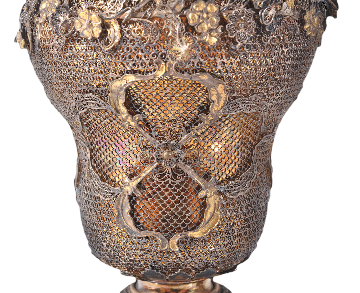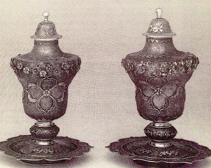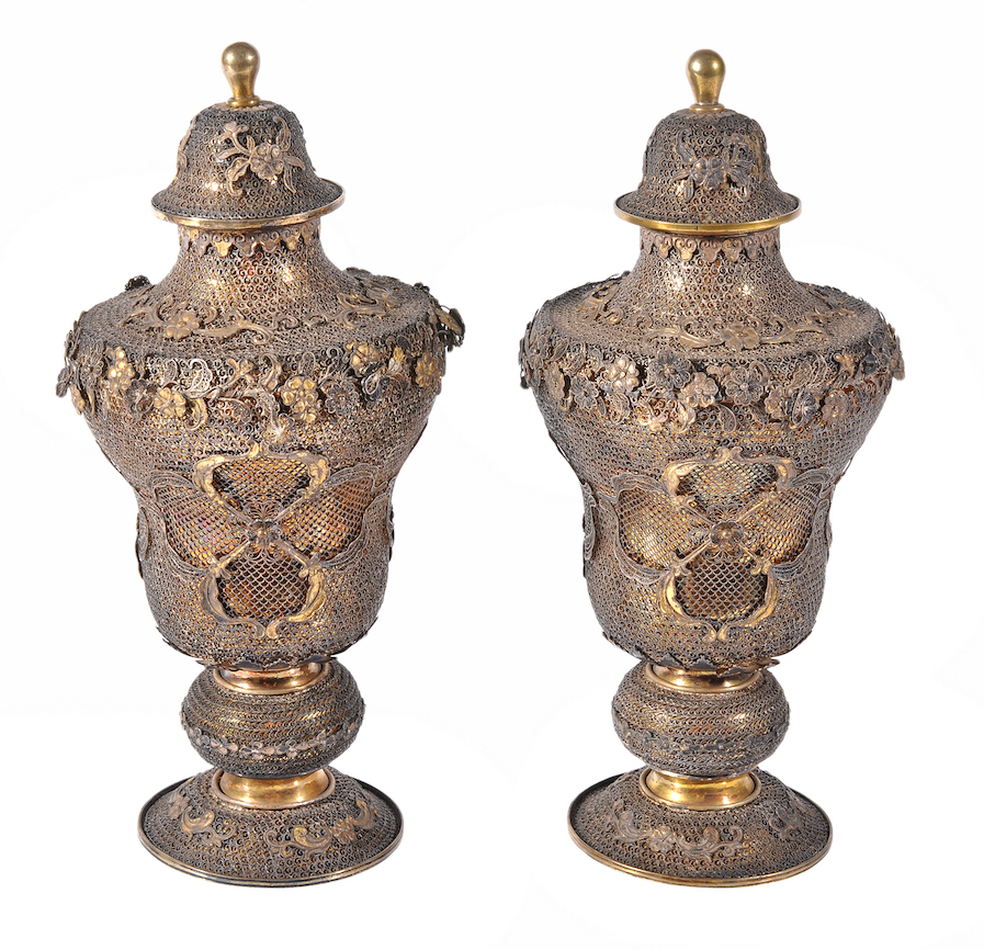 The pair of silver gilt filigree urns we saw at the beginning of this article are incredibly important pieces; they are rare as a surviving pair and they are rare because they are of the late rococo era and could only have been originally made for a person of standing of that era. Who that person was remains a mystery but the urns are a star lot in the auction being held at Dreweatts on 26th February 2014 in their Fine Silver & Objects of Vertu Sale.