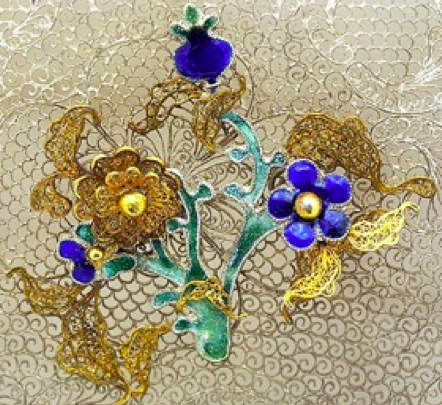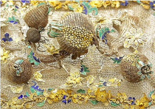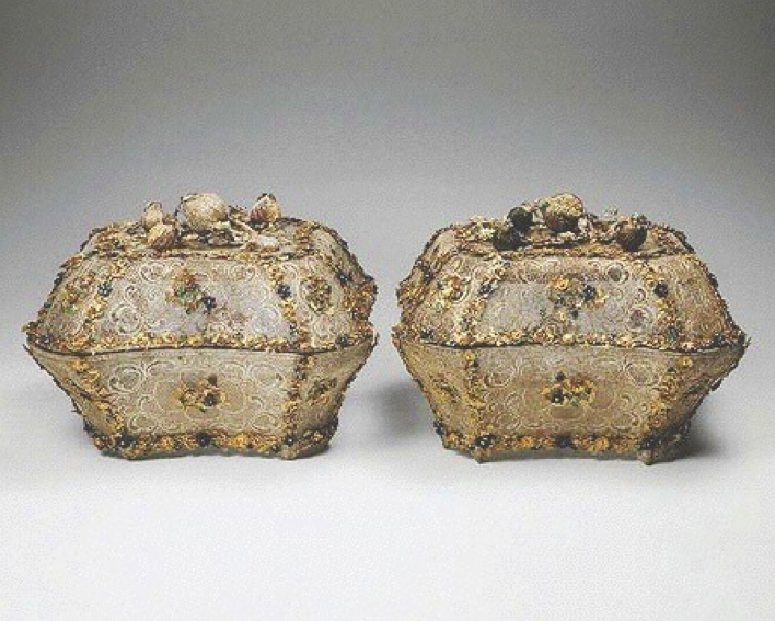 We fast-forward to the mid-18th century the a pair of ornately decorated octagonal filigree silver boxes that came into the possession of Catherine the Great to be used as glove boxes. They are decorated with garlands and branches of flowers and foliage, partially parcel gilded and partially enamelled with blues and greens. The lids are enhanced with a branch of pomegranates and the lid handles have broken pomegranates showing their seeds – a traditional Chinese symbol to invoke many male offspring. The boxes are fully lined in silk.
