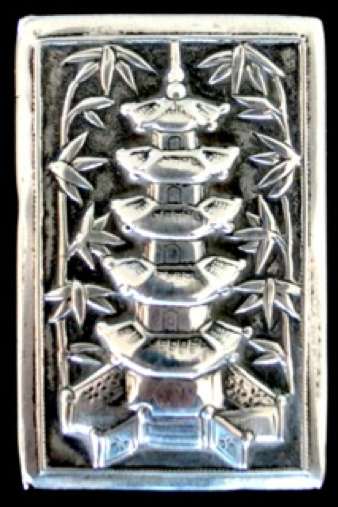 Here we have a Chinese Export Silver matchbox slip cover bearing the mark of the Hong Kong and Canton retail silversmith Kwong Man Shing. Silver slip covers seems to have been more prevalent than vesta cases in China in the late 19th century. They weren’t just a male accoutrement; small matchboxes were made especially for women and they too were encased in silver.