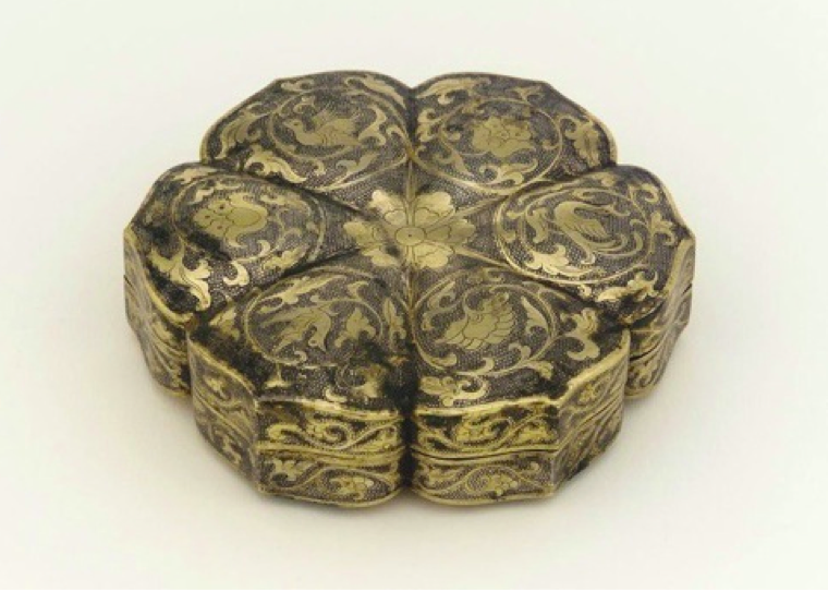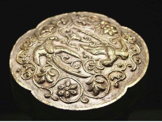 This late 7th century Tang Dynasty silver gilt box from Shaanxi Province takes the form of a six lobed flower decorated with a finely hammered surface upon which repoussé, ring punched and chased decorative motifs are applied, embellished by mercury gilding. It is hard to fathom this box is 1300 years old, yet it amply demonstrates the silver-making tradition China has. The box is displaying traditional motifs that all have allegorical meaning – a sign that a definitive Chinese style was forming.