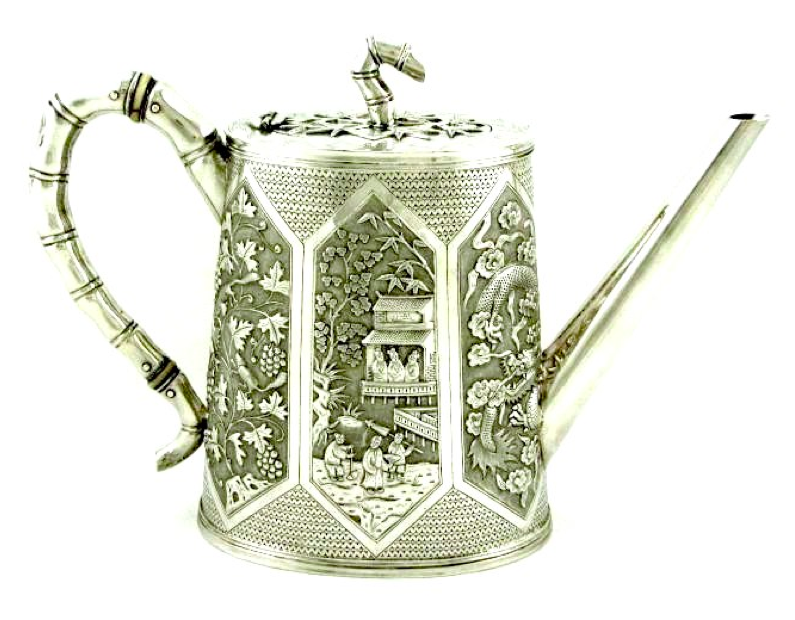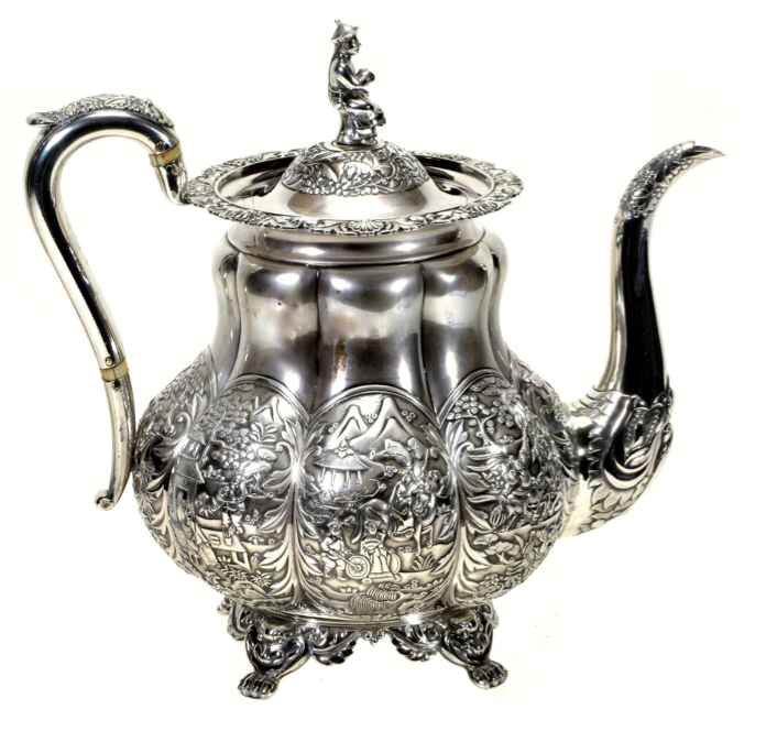 Teapots are so often exemplary examples of the art of silversmithing, but the next Chinese Export Silver item is like a Brueghel painting; the more you look at it, the more one appreciates the happy medium that has been struck here of skill, restraint and love of the art of making.
