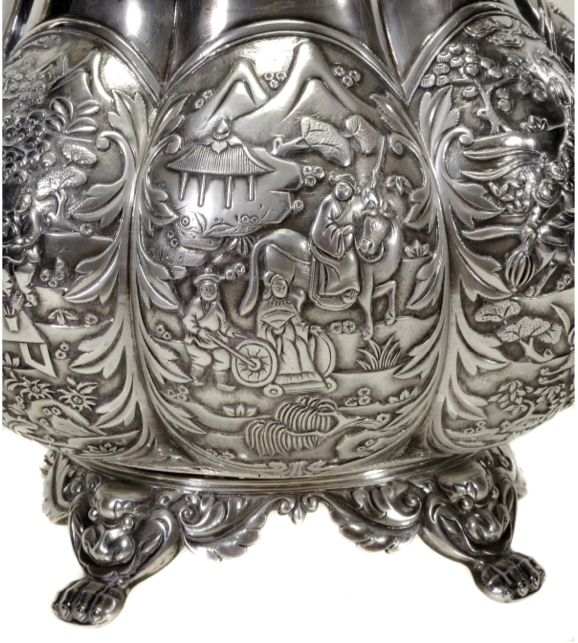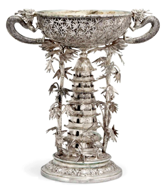 It is made by one of the very established retail silversmiths in Canton, Hoaching*** who also had the reputation of being the best purveyor of carved ivory in 19th century Canton. When one studies the pagoda flanked by giant bamboo, it is very reminiscent of carved ivory; it is busy – there rare even two crane birds feeling at home in all this busy-ness.