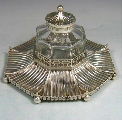 This particular pounce was made by Tu Mao Xing of Tientsin [Tianjin] towards the end of the 19th century. Obviously a specially commissioned piece, it was very much a product of its time when the high Victorian style had become so overtly eclectic with a resurgence of the Chinoiserie style in Britain as this ink stand below attests. Not Chinese Export Silver but made by George Lambert of London in 1891 in the Chinese style.