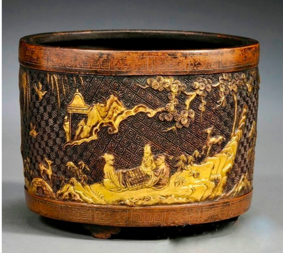 We have here a Ming Dynasty silver gilt and bronze censer; the cylindrical body cast in relief and parcel gilded with Immortals accompanied by auspicious animals in a celestial landscape – all set against a diaper repeat background. The Huí Wén borders are inlaid with silver wire – a wonderful example of how styles and motifs became embedded. The evolution of the Chinese Style is fascinating, taking a thousand years to become definitively and recognisably Chinese it remained constant with only some wayward nods to Western culture that were never meant for the Chinese anyway. The Chinese style is like meeting an old friend; you know where you stand with it. There is nothing inconsequential or flippant about the culture of Chinese decorative motifs; everything had a meaning and combinations so often present an entire allegory or rebus. To the Chinese, it is second nature. It is almost a parallel language. What is comforting is that many Chinese today know and understand it; not something we could comfortably say of Western understanding of the symbolism of Post Medieval painting, for example.