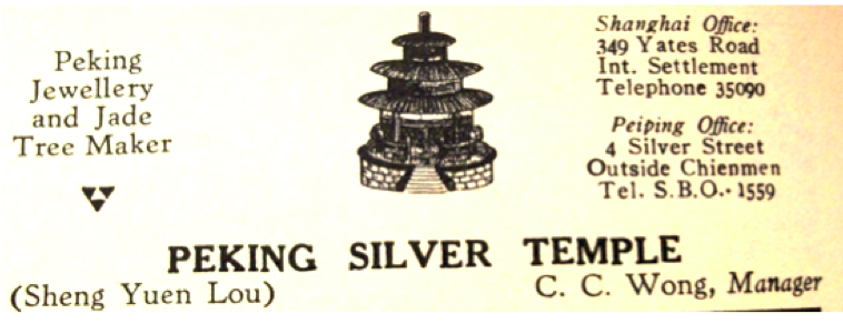 Sheng Yuan traded under the shop banner of “Peking Silver Temple” in English and Sheng Yuan Lou which literally means “The Shop of Sheng Yuan”; we can see this in the commercial directory entry above. We should take a moment to take note of the use of the word “Peiping”. It was in the Ming Dynasty that a garrison was established called “Beiping”  where present day Beijing stands; the place having gone through various name changes through successive previous Dynasties. By the 15th century, the garrison had become a large town and the name became “Shuntian” as well as being called Beijing. The construction of the new Imperial residence, The Forbidden City, was completed in 1420. Fast forward to 1928 and the name was changed back to Beiping [written at the time as Peiping]. Beiping fell to Japan in 1937. The name Beijing was restored in 1949 and sadly, in 1960’s much of the ancient city wall was torn down to make way for expansion and the new subway system.