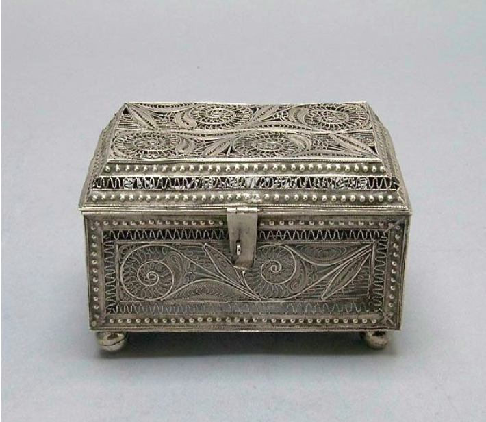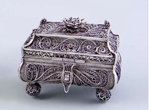 The box we see above was made by the Moscow silversmith Vasilij Potsov and it was made in 1869, the style and the particular form of the silver filigree technique is very Russian, as is the Yu Ying casket. The common denominator between the two boxes is the technique of silver filigree; very much an art that Jewish silversmiths have practised for millennia and to be more correct, it was the Mizrachi Jews; Jews that came from ancient Middle Eastern stock such as Persia, formerly Sassania. Sassanian Jews were known to ply  the Silk Route from the Han Dynasty [206BC-220AD] up until the 10th century AD when a significant number of Sassanian Jews migrated east and settled in Kaifeng. Many were silversmiths and it is how silver filigree influenced and became assimilated into Chinese silver making until the early 20th century.