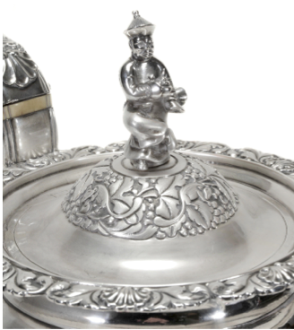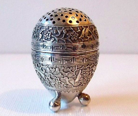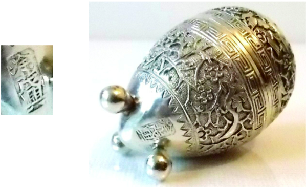 Here we have the first object; nothing unusual or earth shattering about this item, you’ll be all saying. But this object is very unusual, in fact it is the only example of its kind I’ve ever seen in Chinese Export Silver. It is a “pounce”; used to contain pounce – a fine powder made from powdered cuttlefish bone or very fine pale sand used to dry ink after writing a letter or calligraphy. The word pounce is derived from the Latin for pumice by way of the old French word “ponce”