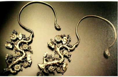 Da Xing made something quite unique and extravagant which I feel the Chinese Export Silver curtain hooks by Da Xingneed to digress totally from the world of the tazza to share. This pair of silver gilt curtain hooks have the upper stems of the hooking device skillfully simulating the appearance of a gnarled and twisted prunus branch with the side branches bearing buds and blossom. The design is fashioned in the round so that both sides show identical motifs. The hooks themselves are fashioned as a serpent-ended swirl – a detail that was hardly noticeable in situ, yet the silversmith nevertheless took such care and attention to.