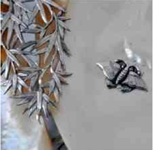 The Chinese love of allegorical decorative motifs is almost always employed,Chinese Export Silver detail of Wang Hing tazza yet there is often the addition of the ingenious, as we can see from this quite superb tazza [above] by Wang Hing. Taking the form of three abalone shells supported by an exquisite bamboo thicket. But that wasn’t enough for Wang Hing, since each shell is affixed to the supporting bamboo culme by silver butterflies [right] that are set off by further bamboo foliage overlapping each shell platter. One can imagine a pair of these tazze gracing a long dining table – pure theatre.
