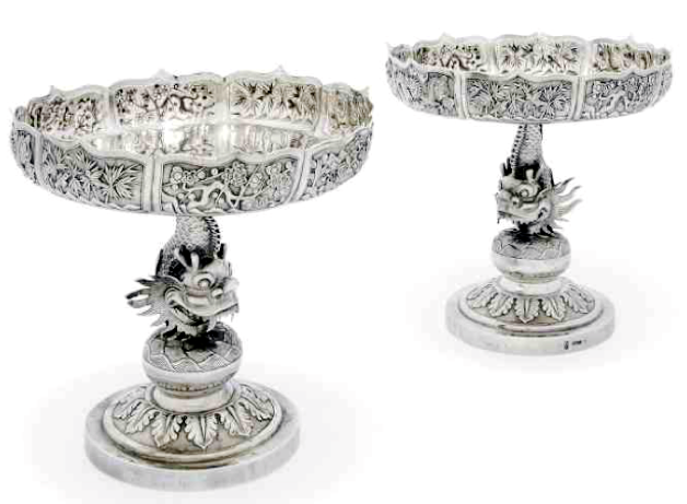 So the scene is set, the tazza is firmly established and we fast forward to the 19th century and we witness a virtual outpouring of silver tazze from the workshops of Chinese Export silver makers. In Europe and America, the late Georgian and Victorian eras created a fashion for silver table centres in the form of épergnes and tazze, often made in pairs. Perhaps this created a ready market for the Chinese silversmiths; we shall never really know. But the Chinese silversmiths found an object which they managed to create an ideal marriage of the intrinsic elegance of the tazza as an object with rather fantastical Chinese motifs.