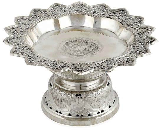 Lastly, we have a highly interesting tazza, made circa 1880 by the  Canton silversmith Da Xing. Da Xing was one of the few mainland Chinese silversmiths of the Chinese Export Silver era producing silver in a separate Singapore-based workshop in the Peranakan [Peninsular Malaysian and Singapore] and Thai [Siamese] styles. Hindu-Islamic in shape and function, yet strangely characteristic of the Chinese in decorative design, Straits Chinese silver is an unusual fusion of two cultural traditions. During the late nineteenth century, large quantities of Straits Chinese silver were being created in small towns in Malaya and Singapore by local Chinese silversmiths. Few also had a presence in China proper.