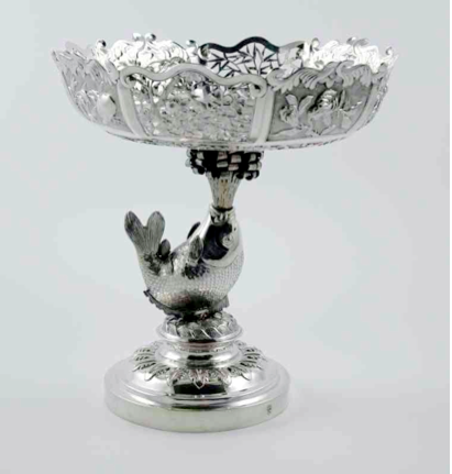 While a dolphin is highly unlikely ever to be found in any Chinese Export Silver piece, nothing could be more natural than carp and its variant the goldfish. Quite whether the tazza pictured below is a goldfish, a fat fish or a carp is not totally clear, but fish [], as a generic decorative motif, have a homophonous relationship with “surplus, abundant”. This is one of the reasons why blue and white porcelain decorated with fish is so ubiquitous in China. The allegorical use for abundance can relate to offspring, wealth and virtually anything else one would wish plenty of.