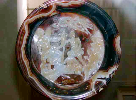 Probably one of the earliest objects we would recognise as a tazza is the so-called Tazza Farnese; created circa 100 BCE of sardonyx, an extremely strong stone with the visual qualities of glass or rock crystal, this object is believed to have been made at the Egyptian Ptolemaic Court, probably during the time of Cleopatra who believed she was a reincarnation of the god Isis. Although “converted” at some stage of it’s life into a Christian chalice, it began life as a pagan libation cup; the technique of decoration being identical to cameo work.