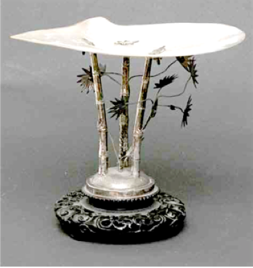 The same combination of bamboo supporting abalone shell, secured by a silver butterfly is used in this small tazza [right] by the ShangHai retail silversmith Luen Wo, circa 1900.