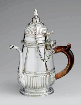 Obviously this is a specially commissioned piece; no other silver cider jug is known to have come out of China, but what is intriguing is the use of English classical motifs that hark back to this fine chocolate pot by Edward Winslow himself.