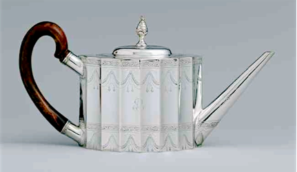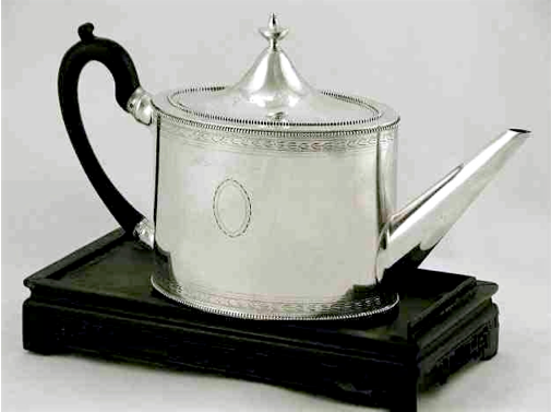 The Georgian silversmiths probably were the best makers of teapots. The classical Georgian forms and decorative motifs were a perfect marriage with silver and this was mirrored in the fashionable clamour for both tea and silver by the rich, famous and infamous of New England. Silver has always been a measure of affluence, especially by the aspiring nouveaux riches. Yet again we see a substantial amount of early Chinese Export Silver landing in Boston; highest quality acquired for a fraction of the cost of comparable contemporary American colonial silver. Boston silversmiths could not have been amused.