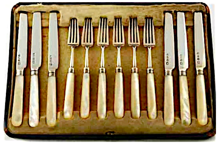 This mother of pearl dessert set is dated circa 1810 and carries the signature Sun Shing pseudo hallmark. Were it not for the marks, this would defy many people to believe it wasn’t the product of a top English or Colonial American silversmith.
