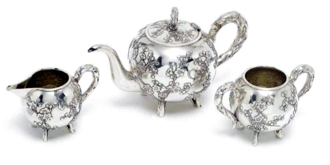 So in the space of just under a century, we discover the two faces of Sun Shing; the master Georgian silversmith on old Canton and the master Chinese silversmith of late the 19th century burgeoning Canton. While it was always the case that the owners of the retail silversmiths governed the house-style of the silver produced under their makers’ marks, the capability to produce both the style and the quality had to be an inherent part of the manufacturing equation. Sun Shing silver was a constant of high quality, no matter the style, as we see from this tea set in the high Chinese style circa 1880. While it is definitely Chinese, it still somehow retains a classic and refined quality to it.
