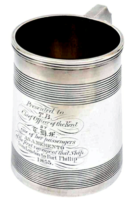 The tankard we have on the left is probably one of the last tankards Sun Sing made in the classic style. The inscription is dated 1853 and was presented to the Chief Officer of the HMS Kent by an immigrant to mark the maiden voyage of the Kent from England to Port Philip in Australia. It is particularly interesting that the donor, Thomas Howard Fellows, chose to give a piece of Chinese Export Silver. Fellows was on his way with his family to settle in Melbourne, not unusual in itself but perhaps not a coincidence that Melbourne had a substantial Chinese community in the early 19th century and at least two successful retail businessmen returned independently to China to open businesses which soon became the largest department stores in China – Wing On and Sincere & Co; both produced Chinese Export Silver in their own workshops under their own makers’ marks. Wing On and Sincere exist today and Fellows became fifth judge of the Supreme Court of Victoria.